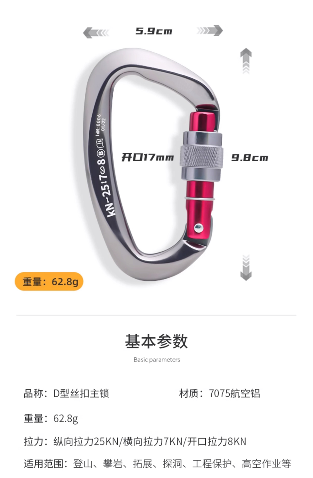 操作意义:小D型丝扣主锁是攀岩装备中一种特殊设计的连接装置,其操作意义主要体现在以下方面:1. 结构特性与受力优势D型设计:单边直边结构可将受力集中于锁体主脊,相比O型锁强度提升约30%,适合高负荷场景。2丝扣锁门通过螺纹旋紧实现双重锁定,降低意外开启风险3。轻量化:相同强度下比H型锁轻15%-20%,适合阿式攀登等对重量敏感的场景。